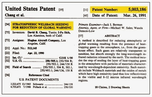El 26 de marzo de 1991 El ejército de Estados Unidos compró la patente # 5,003,186 - La Siembra estratosférico Welsbach para la Reducción del Calentamiento Global